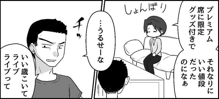 私(ヨシノ)は、夫のタテルと高校生の息子ナオヤとの3人暮らし。このたび推しの特別公演のチケットが当選! しかし2週間前になって遠方の義父が入院し、夫には「ライブはキャンセルしろ」と言われてしまいました。義母の口ぶりでは急を要する事態ではないという雰囲気でしたが、自分だけ浮かれていたらきっと夫を傷つけてしまうのでしょう。私はタイミングが悪かったと思って、今回のライブはあきらめた方がいいだろうと思いはじめたのでした。