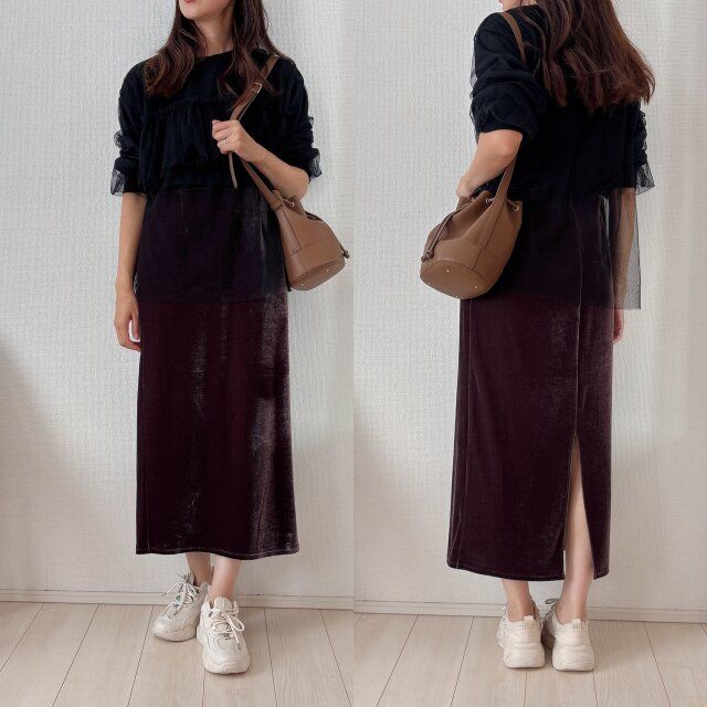 身長171cm、イエベのライターmakiです。今年もベロアがトレンドですよね!GUでみつけたロングスカートがはくだけで主役級にかわいかったのでご紹介します。