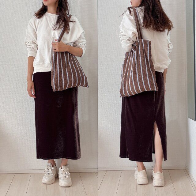 最後はホワイトのスウェットを合わせてカジュアルコーデにしてみました。アラサーが着ると部屋着感が強くなりがちなスウェットも、ベロアスカートと合わせると上品なコーデになります。足元もスニーカーで動きやすい秋の行楽コーデにもピッタリです。