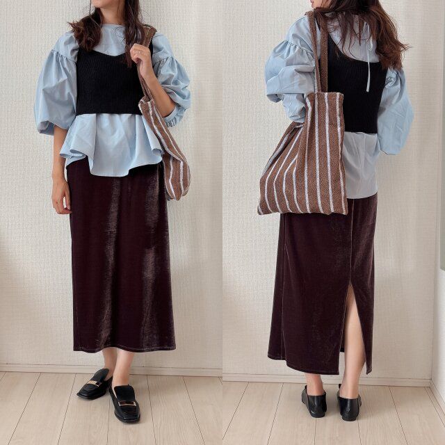 次はブルーのブラウスとビスチェを合わせてトレンドのブルー×ブラウンの配色コーデにしてみました。ブラウスだけだとメリハリがなかったので、ビスチェをプラスしてメリハリのあるコーデにしました。