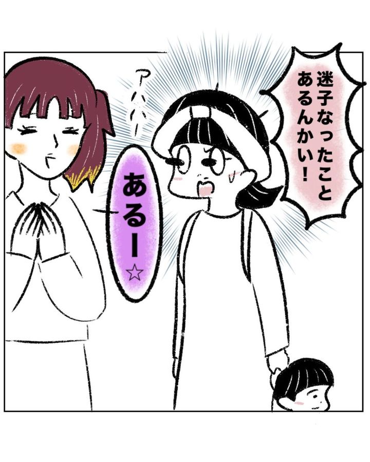 「でもね、好奇心旺盛なのはいいことだし、仕方ない!それにいつもすぐ見つかるし、問題ないよ!」と迷子になったことを全く気にしていないつーくんママにまるさんは唖然。