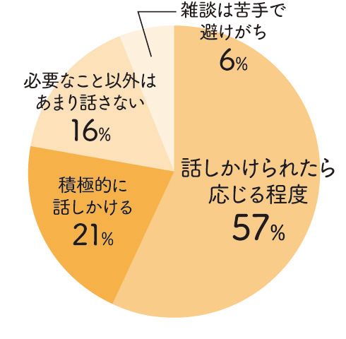 ▶誰にでも気軽に話しかけるのではなく、仕事で絡む人とは話しかけます。仕事がスムーズにいったり、多少の無理もきいてくれるようになるので、嫌いなタイプの人でも我慢しながら世間話などをしています(S・T/営業事務)