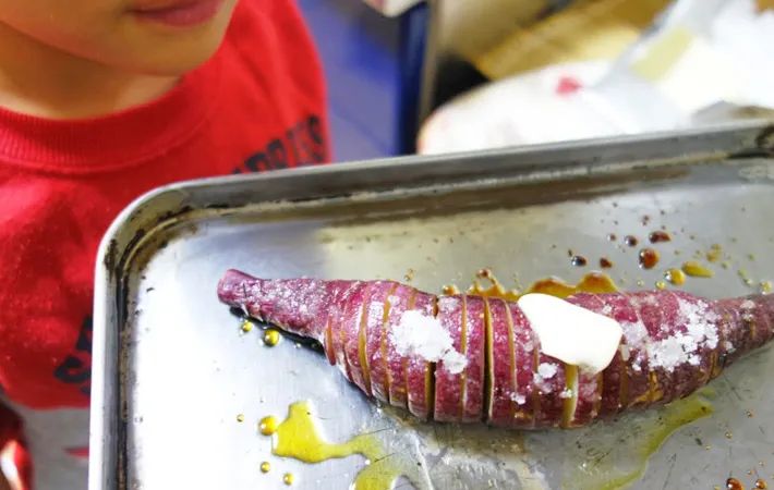 ハッセルバックは一般的にはジャガイモをじゃばらに切って焼く料理。ジャガイモの代わりにサツマイモを使えば、子供も喜ぶおいしいスイーツを作れますよ。