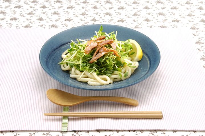 ゆりさんによれば、このレシピの最大の魅力は、とにかく「簡単ですぐにできる」こと。豆苗にベーコンを合わせた具材の調理も「電子レンジで冷凍うどんをチンしている間に、ほぼ作れちゃうくらい簡単」という。