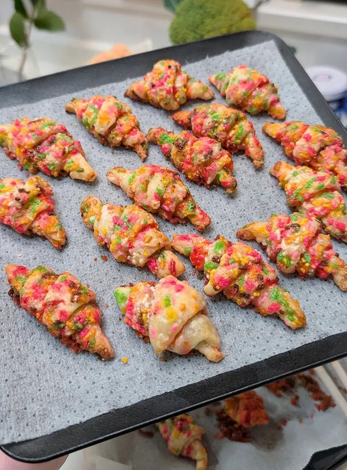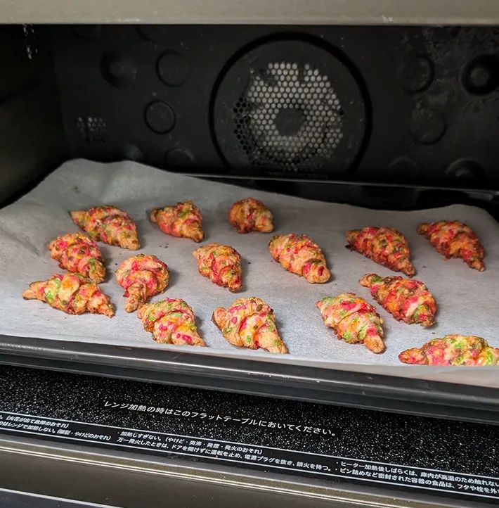 カラースプレーの色合いは、加熱してもそのまま残り、華やかな『カラフルクロワッサン』が完成しました。