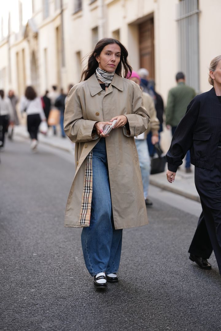 クラシックなトレンチコートは、ワイドレッグジーンズとも相性抜群の万能アイテム。仕上げにツートーンのローファーとシルクスカーフを合わせれば、まるで往年のハリウッド女優のようなクラシカルムードが漂う。