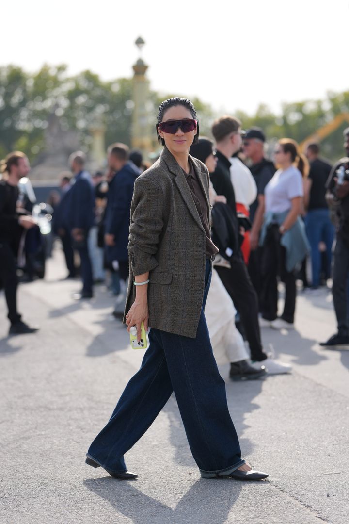 ワイドレッグデニムは“永遠の定番”でありながら、実は2025年秋冬のランウェイでも多くのブランドが取り入れてたアイテム。たとえば「クロエ」のショーでは、ハイウエストのデニムにロマンティックなレースブラウス、ロング丈のチェックコート、そしてTストラップのバレエシューズを合わせたルックが登場。