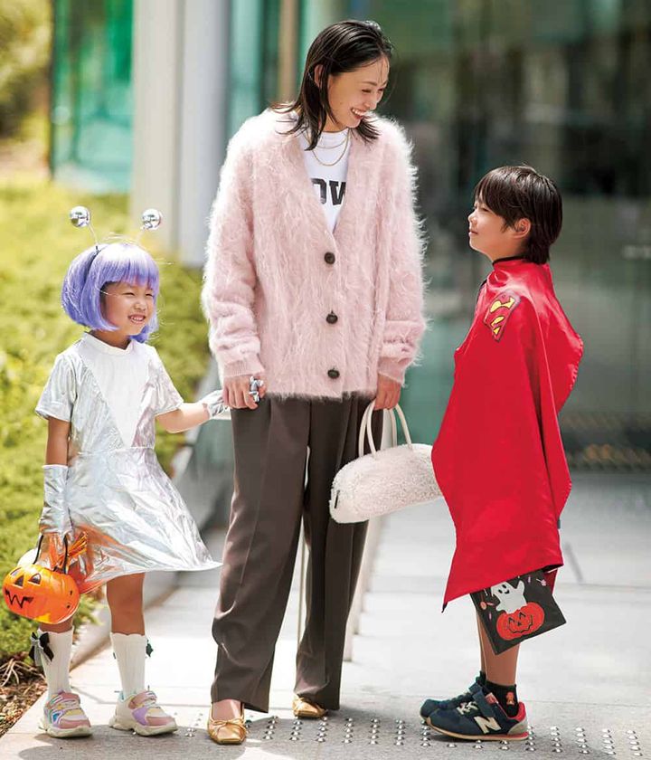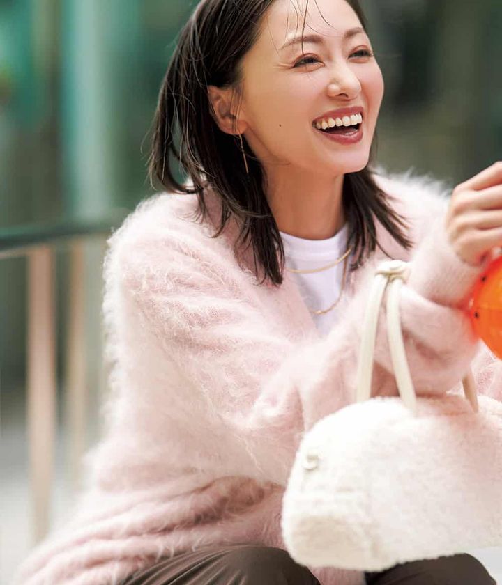カーディガン¥97,900(カオス/カオス丸の内)カットソー¥12,980(チャンピオン/ヘインズブランズ ジャパン カスタマーセンター)パンツ¥33,000(アストラット/アストラット 新宿店)バッグ¥14,300(ツル バイ マリコ オイカワ)パンプス¥40,700(チェンバー/クルーズ ショールーム)ピアス¥30,800(ココシュニック)ネックレス¥44,000(ブランイリス/ブランイリス トーキョー)