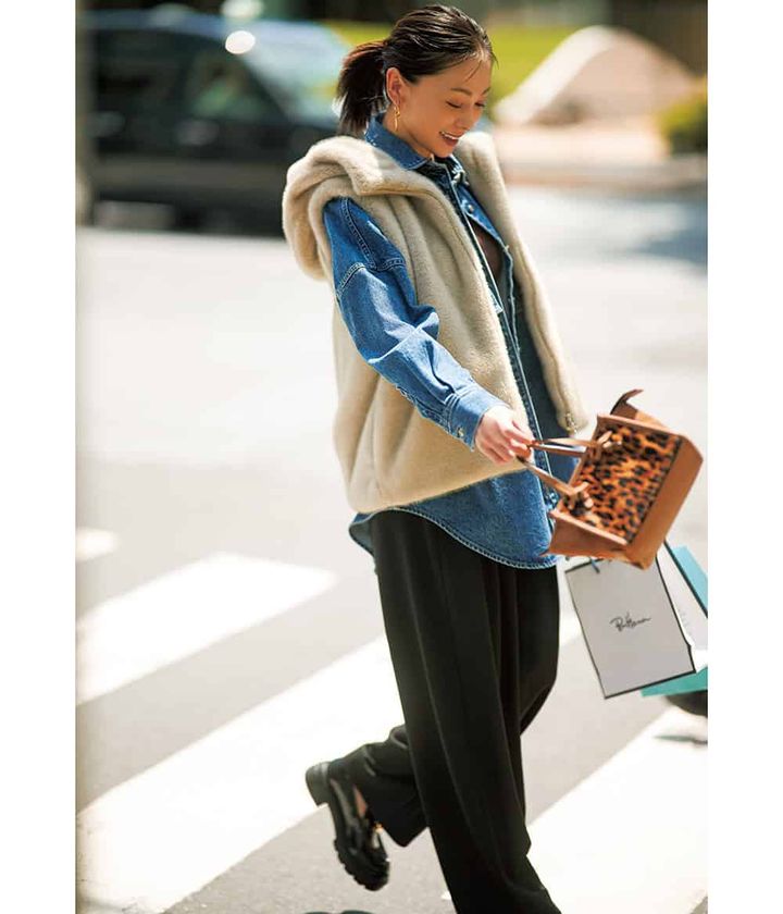 ファーベスト¥25,300(アルページュストーリー)デニムシャツ¥47,300(サクラ/インターリブ)タンクトップ¥19,800(ハイク/ボウルズ)パンツ¥16,500(ico/Siro Co., Ltd.)バッグ※送迎¥17,600(ノマディス/ノーベルバ)バッグ※自分時間¥75,900(ジャンニ キアリーニ/ジャンニ キアリーニ 銀座店)ローファー¥26,950(スタッカート/バロックジャパンリミテッド)イヤリング¥41,800(ブランイリス/ブランイリス トーキョー)