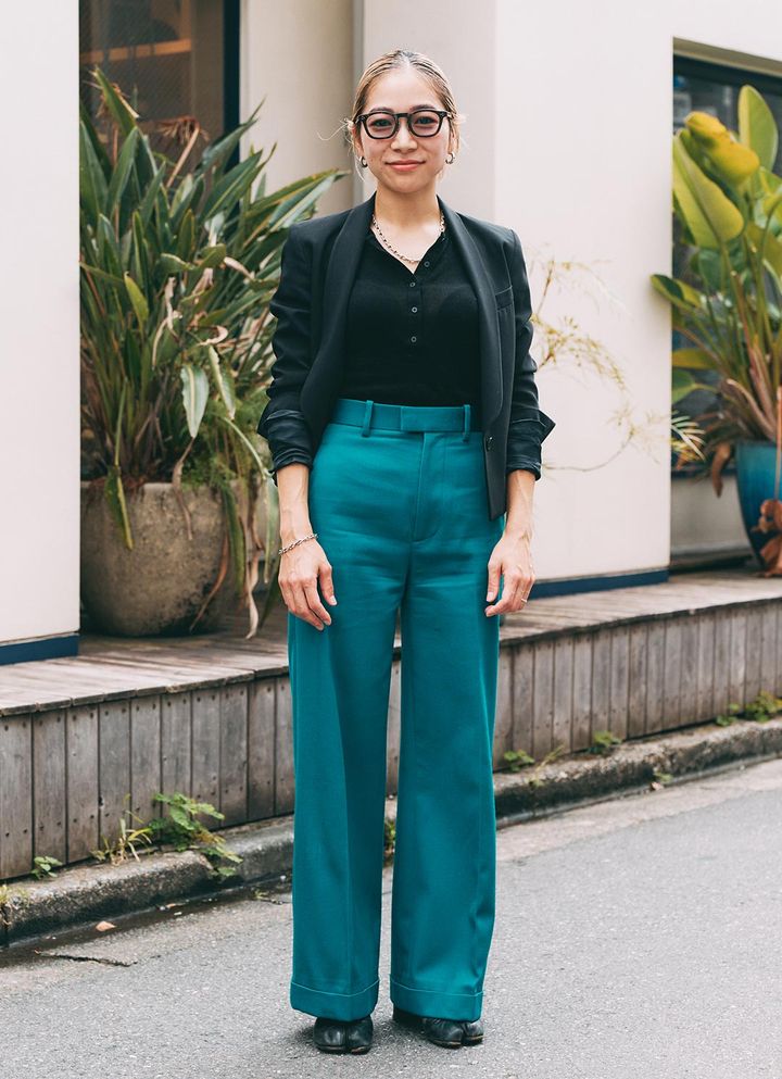 『メゾン マルジェラ』の足袋ブーツがターコイズブルーのボトムスと絶妙にマッチ! モードスタイルには欠かせないアイテム。