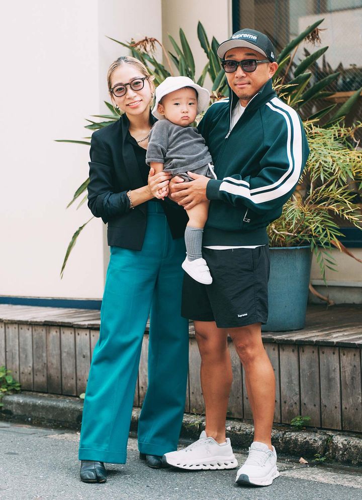 家族で上品なモノトーンでまとめつつ、ママのターコイズブルーのパンツが挿し色役に大抜擢。ハイブランドとカジュアルアイテムを上手にミックスした、街へのお出かけが楽しくなる秋のファミリーコーデが完成!