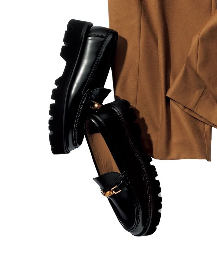 パンツ¥66,000(リ・コード/サードマガジン)ニット¥88,000(デパリエ/デパリエ 伊勢丹新宿店)バッグ¥69,300(イアクッチ/イアクッチ 大丸東京店)靴¥66,000(ネブローニ)ピアス¥33,000(リューク)リング¥25,300(Jouete)