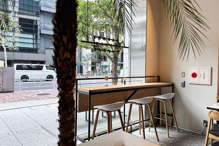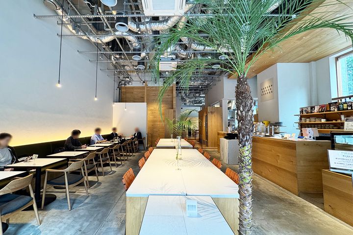 店内は天井が高く開放感抜群。ホワイト×木目で統一されたインテリアや、店内を彩る観葉植物によって、都会的でありながらリラックスできる雰囲気です。気負いなく肩の力を抜いて過ごせる空間が広がっています。