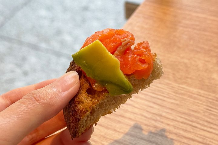 プレートの内容は日替わりで、取材時(2025年10月)は、パン2種類(食パン、カンパーニュ)、サラダ、7種類のデリ(ひよこ豆のペースト(フムス)、アボカドスライスとフライドオニオン、サーモン、豆のマリネ、キャベツのマリネ、トマト、ゆで卵)が色鮮やかに盛りつけられていました。プレートはヴィーガン仕様に変更することもできます。