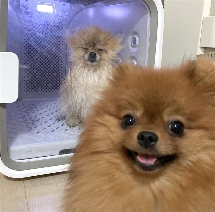 ドライヤーボックスの中と外にそれぞれいるポメラニアンたち。 その時の様子を収めたツーショット写真が話題となっています。