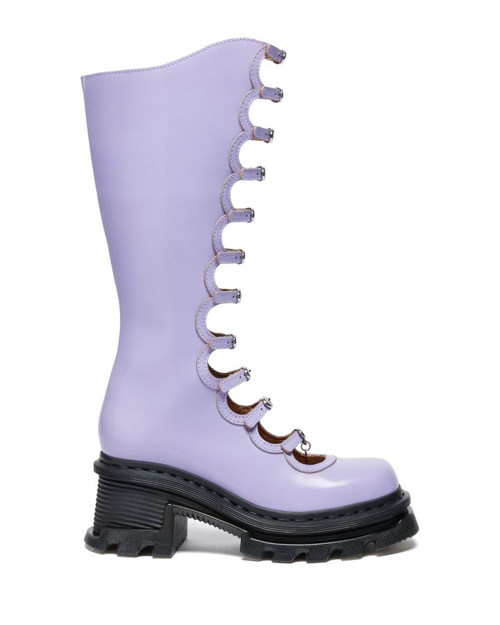 カラーは定番のブラックと、遊び心あふれるブライトラベンダーの2色で展開。ドクターマーチンの「ブッテロレザー」を使った質感は、クラシックでありながらアヴァンギャルド。ステッチはアイコニックなイエローとシックなブラックで仕上げられ、細部にはシルバーバックルや鍵のチャームなど、過去のコラボへのオマージュも込められている。