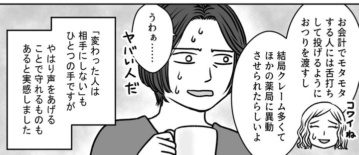 その後友人から聞いた話では、例の受付女性はほかの患者さんへの対応も悪く、クレームが相次ぎ薬局を異動せざるを得なくなったそうです。