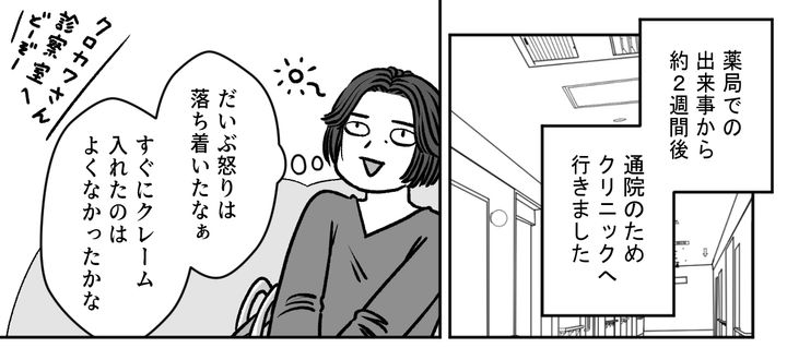 薬局で失礼な接客をされてから約2週間後、頭痛とはちがう症状でいつものクリニックへ行きました。その頃にはすでに怒りは落ち着いており、私にとっては過去の話になっているので、薬局で起こったことを先生にも淡々と伝えました。