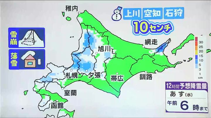あす19日(水)午前6時までの12時間降雪量は、石狩や岩見沢、夕張、幌加内町周辺など多いところ10センチくらいでしょう。傾斜地でのなだれや、積雪が多くなったところでは屋根からの落雪にも注意してください。