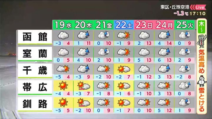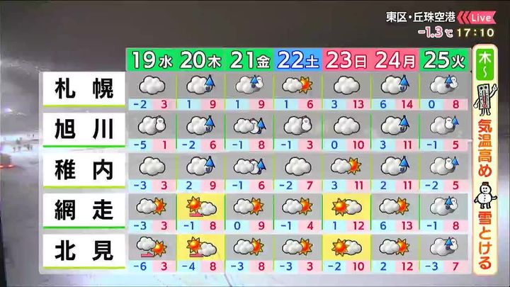 ※18日午後5時時点の情報です。最新の気象情報は、HBCウェザーセンターのホームページなどでご確認ください。HBCは気象庁の認可を2001年に得て以来、民間気象会社の一つとして「HBCの独自予報」を発信しています。