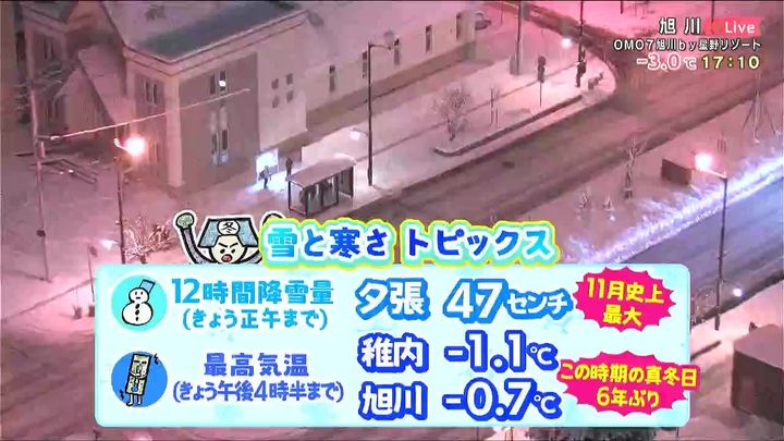 また、稚内や旭川の午後4時半までの最高気温はマイナスで、このままいくと最高気温が0度に届かない真冬日になります。この時期の真冬日は6年ぶりで、いつもより冬将軍の目覚めが早いですね。