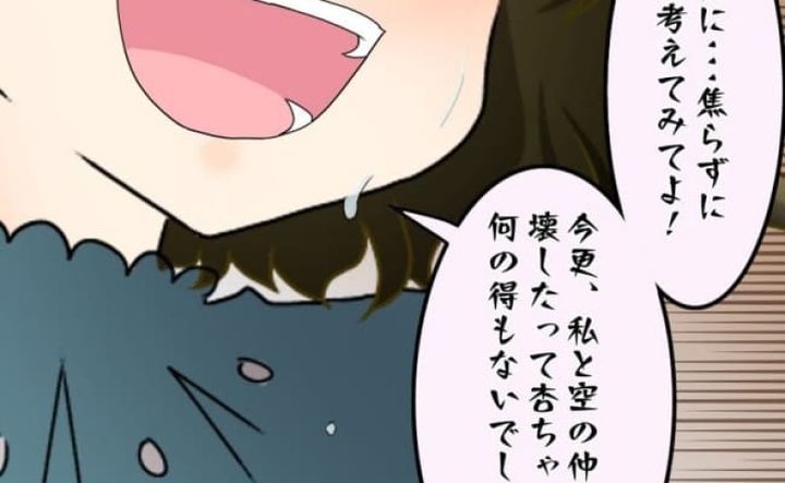 謝った言い張る宇美さんに杏さんが「私……謝ってもらってないわよ……」とひと言告げます。すると宇美さんは「謝った気がするんだけどなー……」と誤魔化しまた今さらだと主張します。そして「今さら、私と空の仲を壊したって杏ちゃんには何の得もないでしょ?」「人の幸せを壊して満足する?違うよね?」と焦りを見せます。