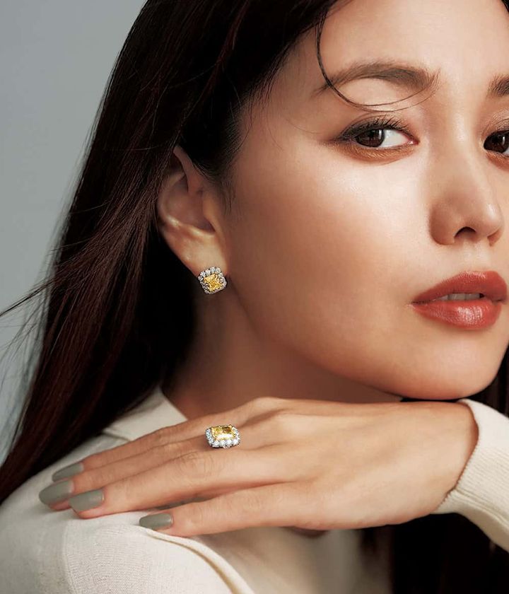 イヤリング「アイコン」[WG×YG×イエローDIA(1.53、1.51ct)×DIA]¥11,160,000リング「アイコン」[WG×YG×イエローDIA(2.00ct)×DIA]¥9,010,000(ともにグラフ/グラフダイヤモンズジャパン)ニット¥132,000(ブラミンク/ブラミンク トーキョー)
