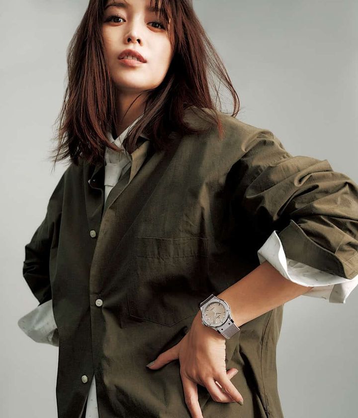 時計「クラシック・フュージョン エッセンシャル トープ」42㎜¥1,166,000(ウブロ/LVMHウォッチ・ジュエリー ジャパン ウブロ)タイシャツ¥38,500(デパリエ/デパリエ 伊勢丹新宿店)カーキシャツ¥56,100(マディソンブルー)