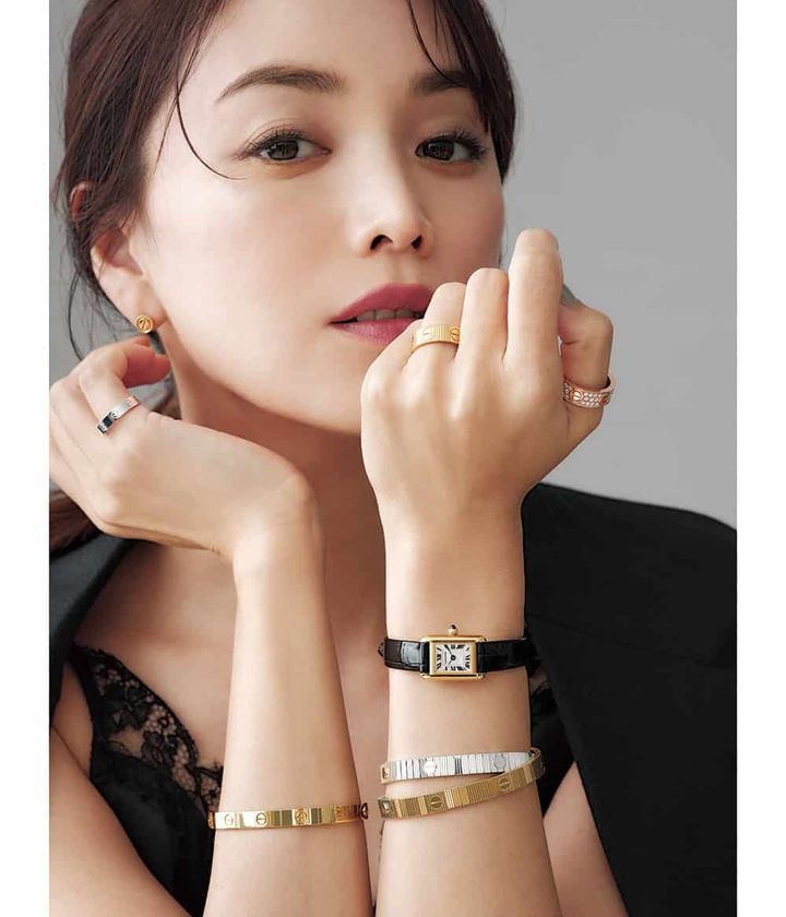 〈左手〉2本繫げたブレスレット「LOVE アンリミテッド」[YG]¥1,491,600[WG]¥1,597,200時計「タンク ルイ カルティエ」[YG、アリゲーターストラップ 24×16.5㎜]¥1,333,200リング薬指「LOVE アンリミテッド」[YG]¥429,000親指「LOVE」[PG×DIA]¥1,755,600〈右手〉ブレスレット「LOVE」[YG]¥1,254,000リング小指「LOVE」[WG×DIA]¥434,500イヤリング「LOVE」[YG]¥272,800(すべてカルティエ/カルティエ カスタマー サービスセンター)ジャケット¥59,840(エイチ ビューティー&ユース)キャミソール¥26,400(プルミエ アロンディスモン)