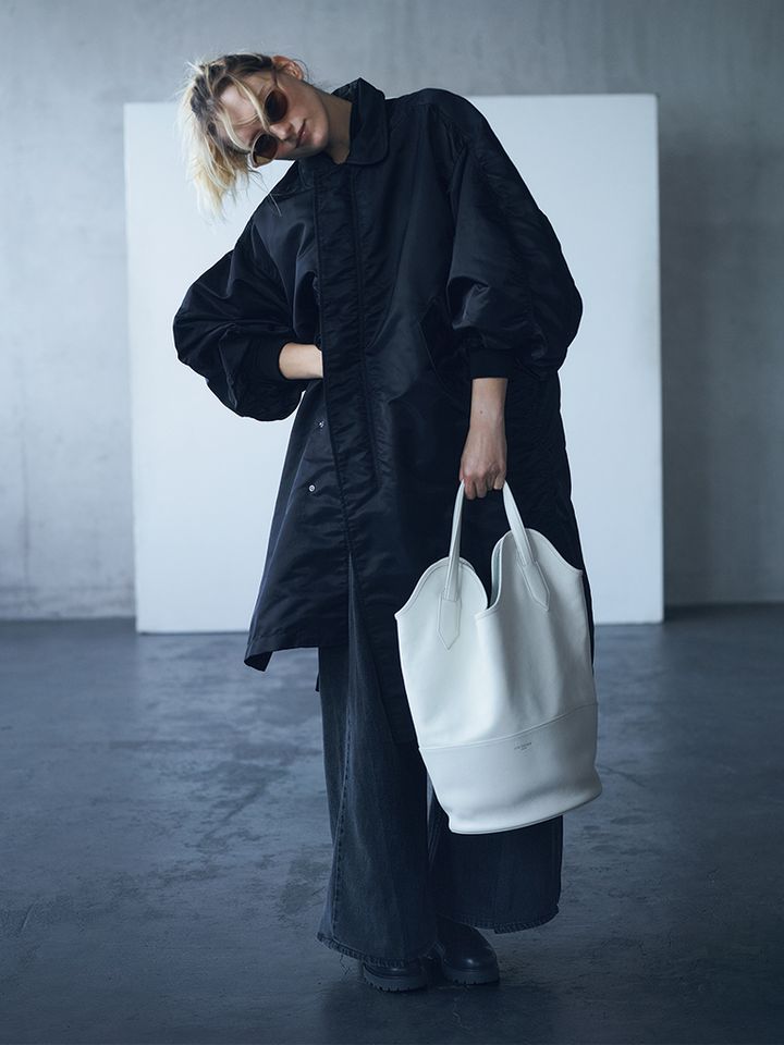 黒にいっそうの迫力をもたらす長め丈でブルゾンをモードに転換。ひかえめなステンカラーで見た目の合わせやすさを保ちながら、撥水性や止水Wファスナーなど悪天候にも向く使い勝手のよさを加味。黒デニムもアウターの迫力に負けない幅広ワイドでとことんハンサムに。