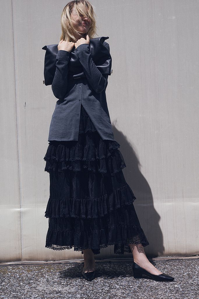 黒レーススカート/YUHAN WANG(エディット フォー ルル) グレードレープシャツ/PHEENY バッグ/PUNTI.(エルディスト ショールーム) シューズ/PELLICO(アマン)