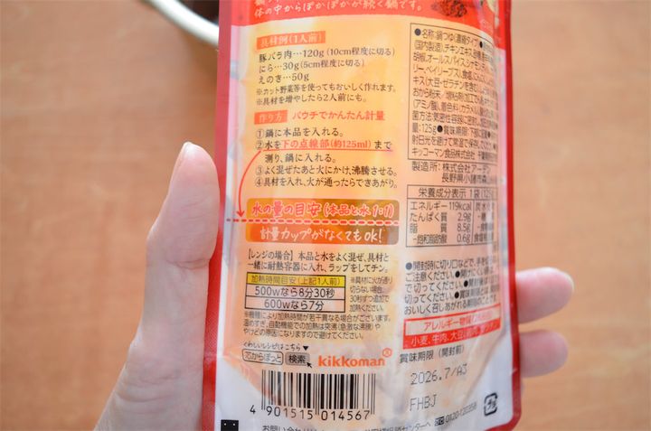 この鍋つゆの素の袋が、そのまま軽量カップになるんです。