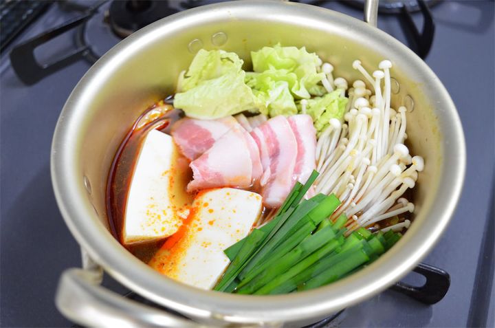 2. 小鍋に鍋つゆを入れ、空になった袋で同量の水125ml(分量外)を量り、鍋に入れる。中火にかけてひと煮立ちしたら具材を加え、火が通るまで煮る。