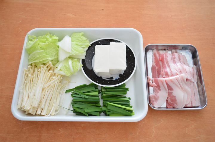 1. えのきは石づきを切り落とし、小房に分ける。ニラは5cm長さに切る。白菜は食べやすい大きさに切る。豚肉は10cm長さに切る。豆腐は食べやすい大きさに切る。