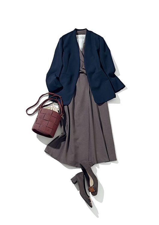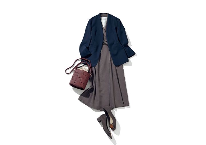 ジャケット¥34,100/ドレスレイブ(ジオン商事) ジレワンピース¥25,300/イチエ(シュガー・マトリックス) ロゴTシャツ¥3,498/ロペピクニック(ジュン) スクエアパンプス¥9,900/RANDA バケツバッグ¥6,996/デッサン(ワールド)