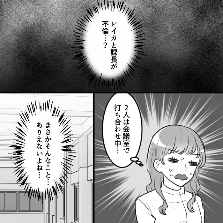 婚活中のマキは、ある日同僚のレイカを合コンに誘う。テンション高く声をかけたが、彼女にはあっさり「仕事に集中したいので彼氏を作る気はない」と断られてしまう。頭が良く、仕事が早い優秀なレイカに憧れるマキ。しかし、ある日廊下で女性社員たちが「課長とレイカが不倫している」と話しているのを聞いてしまう。信じられない噂話に驚くマキは真相を確かめにレイカの元へ向かうが、なんとそこで衝撃の光景を目にすることに!?