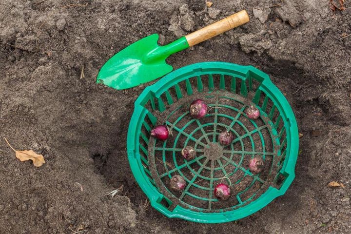 小さな球根を庭で見失わないように、ザルなどに入れて植えておくと、分球した球根もいっぺんに掘り上げられて便利です。丈夫で育てやすい小球根をぜひ試してみてください。