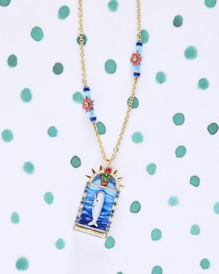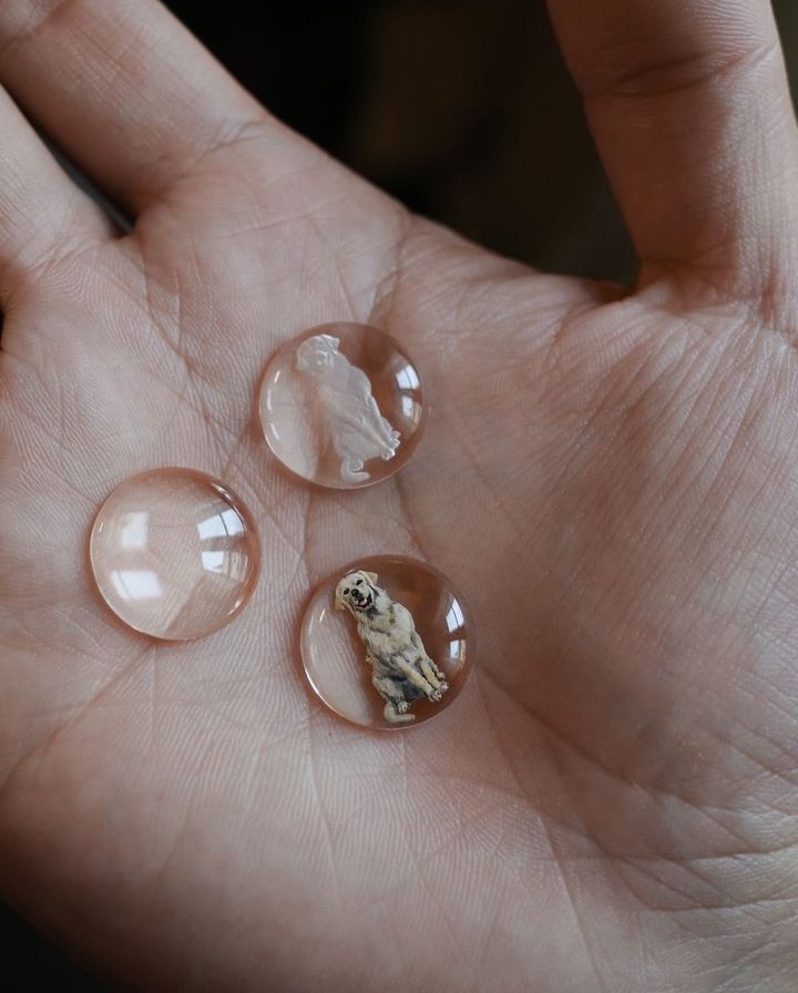 カスタムオーダーのジュエリーは、19世紀に英国で生まれた“エセックス クリスタル”と呼ばれる手法を用いて制作。カボションのロッククリスタルの裏面に絵柄を掘り込み、エナメルで緻密に彩色するという複雑な工程を、熟練職人が数週間かけて仕上げる。愛らしさとアートピース級の存在感を併せ持つ1点ものだ。