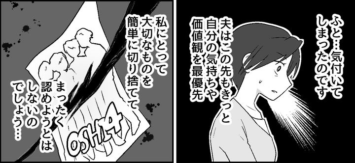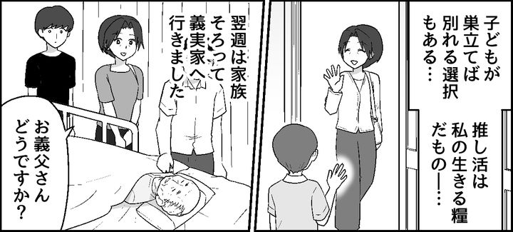 息子はもう高校生だし、数年経てば巣立っていくでしょう。私も仕事をしているので、ひとりになっても経済的に困ることはないはずです。人生に楽しみや喜びを与えてくれる推し活と、私の意志なんてまるで無視の夫。私の人生に本当に必要なのはどっちだろうな……なんて考えてしまうのでした。