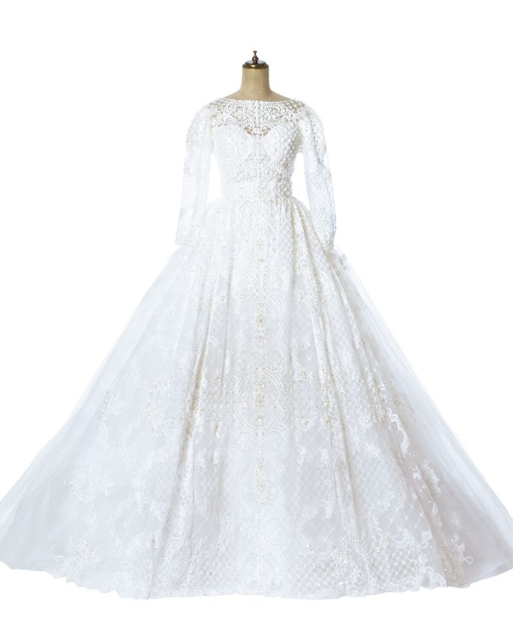 スワロフスキー・クリスタルやパールをたっぷりとあしらった、贅を尽くしたボリュームドレス。「まるで宝石をまとったかのような煌めきと優美なレースで支持される一着です」(谷口さん、以下同)