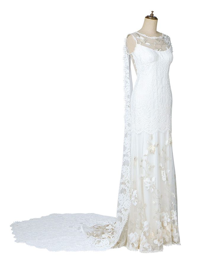 シャンパンカラーのエンブロイダリーレースが印象的。「透け感のあるチュール素材とハンドドレープを施したケープが取り外せる2ウェイタイプが人気の理由です」(橋本さん、以下同)