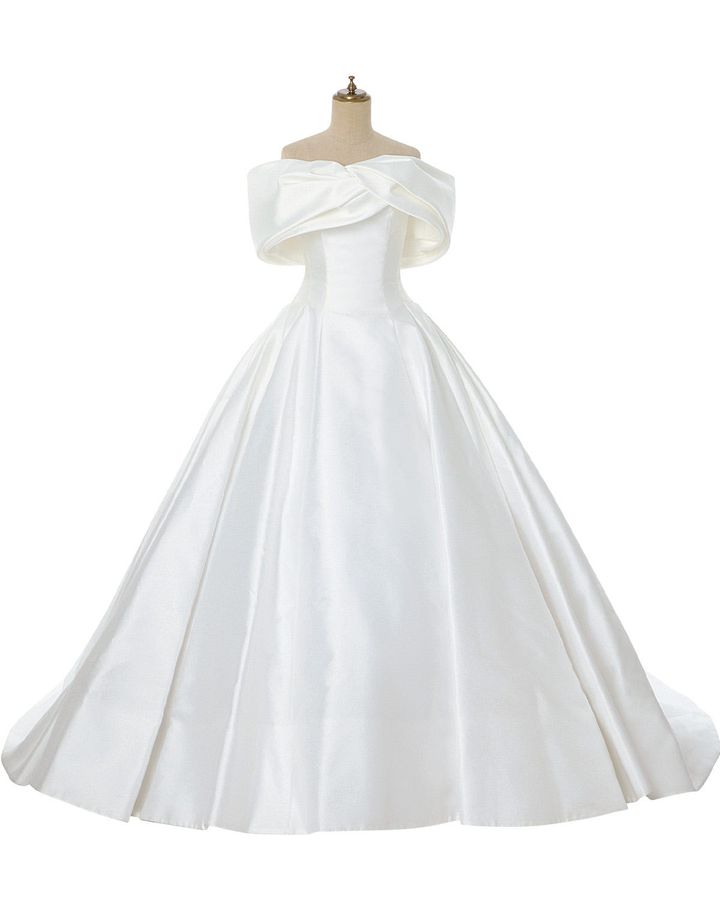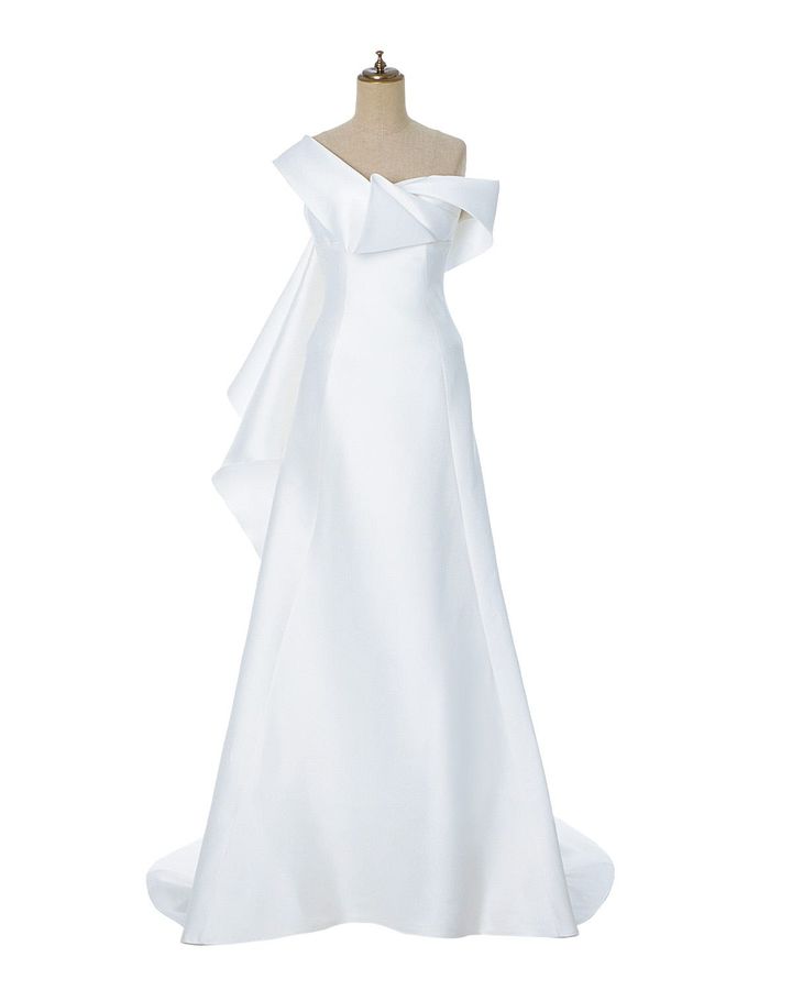 つややかなシルクの素材感が際立つ、構築的なAラインドレス。「オフショルダードレスをモダンに昇華したデザイン。程よいボリューム感で、挙式や披露宴の場所の広さを問わず着用できるのが魅力です」