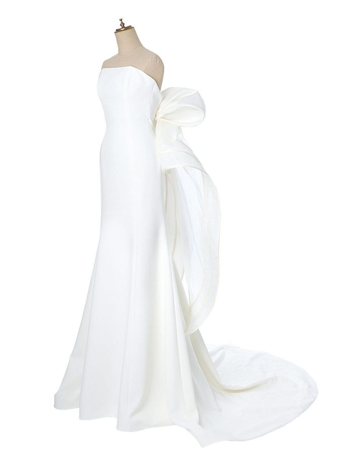 ストレッチクレープのしっとりとしたドレープが美しいマーメイドドレス。「スレンダーなドレスは、バックスタイルに特徴のあるデザインが支持されています」