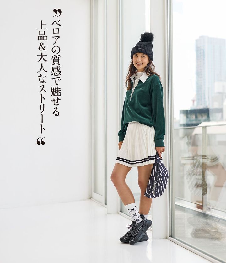 ベロアシャツには、ニットキャップや ゼブラ柄のバッグなど、あえてカジュ アル路線に振り切った小物を。対 比でトップスの上品さが際立ちます。