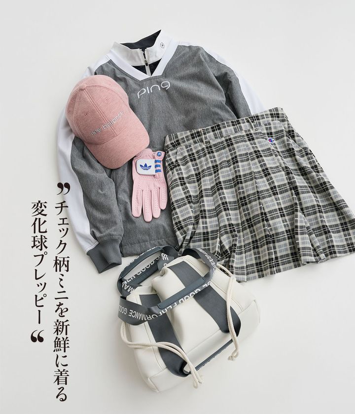 スカート¥17,380(チャンピオン/ヘインズブランズジャパンカスタマーセンター)トップス〈2枚組〉¥19,800(ピンアパレル/TSIお客様相談室)キャップ¥4,950(ニューバランスゴルフ/TSIニューバランスゴルフセクション)グローブ〈片手〉¥4,400(アディダスゴルフ)バッグ¥12,100(ユナイテッドアローズゴルフ/ユナイテッドアローズ日本橋店)