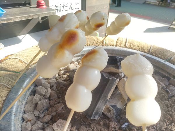 長瀞駅から岩畳へ向かう道中には、賑やかな商店街が続きます。美味しそうな食べ物の誘惑があちらこちらにありますが、やはり山あいに来ると焼き団子の香ばしい匂いに誘われます。香ばしい団子を頬張りながら、次の紅葉スポットに向かいます。