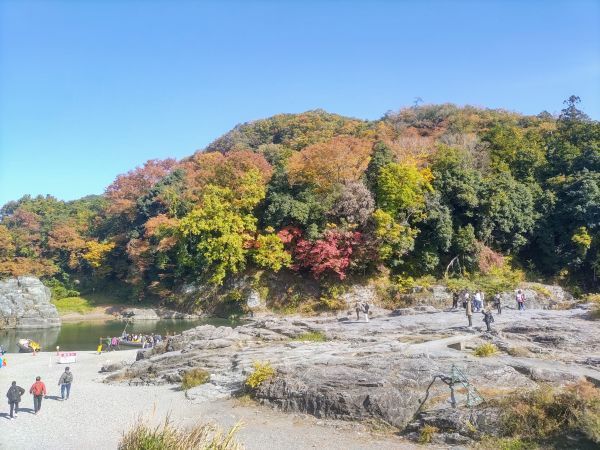 まずは、秩父と言えば長瀞!長瀞駅で降りて歩くこと数分。 目の前に広がるのは、荒川に沿って何百メートルも続く、まさに天然記念物とも言える巨大な岩畳です。この時期は、水辺の雄大な岩肌と両岸の山々を染める赤や黄色の紅葉とのコントラストがとにかく鮮やか!