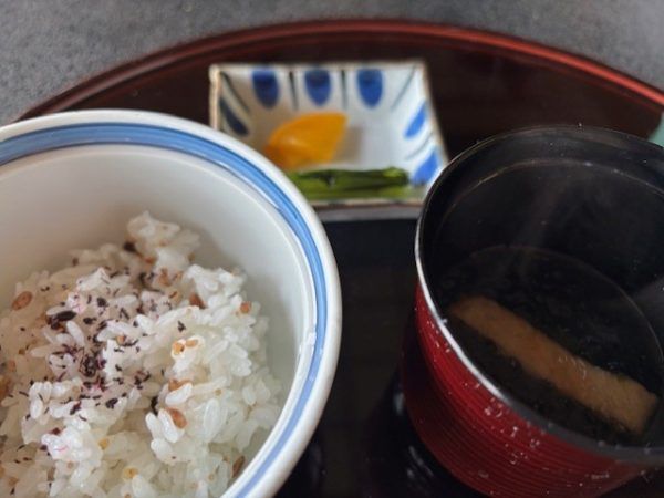 十八雑穀飯。あれ、ゆかりってこんなにおいしかったけ?と思うほど。白みそお椀にも和食の良さを感じ、ほっとできました。