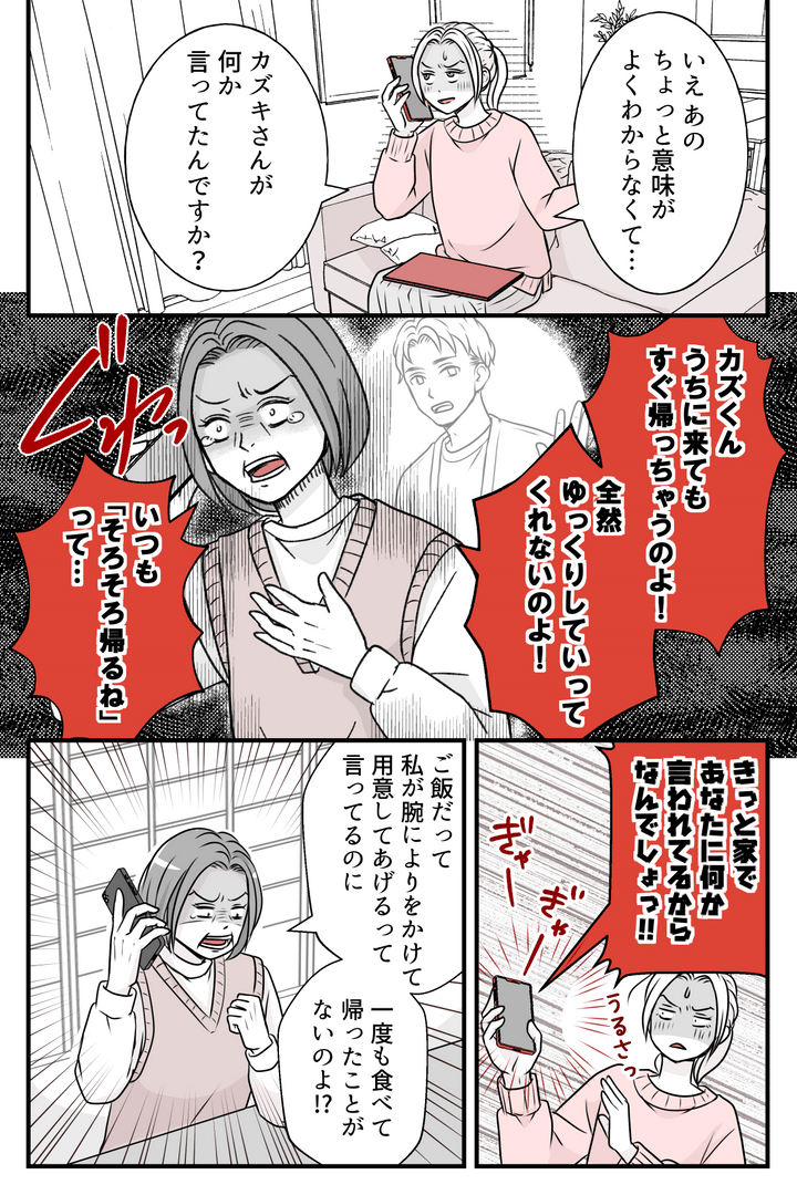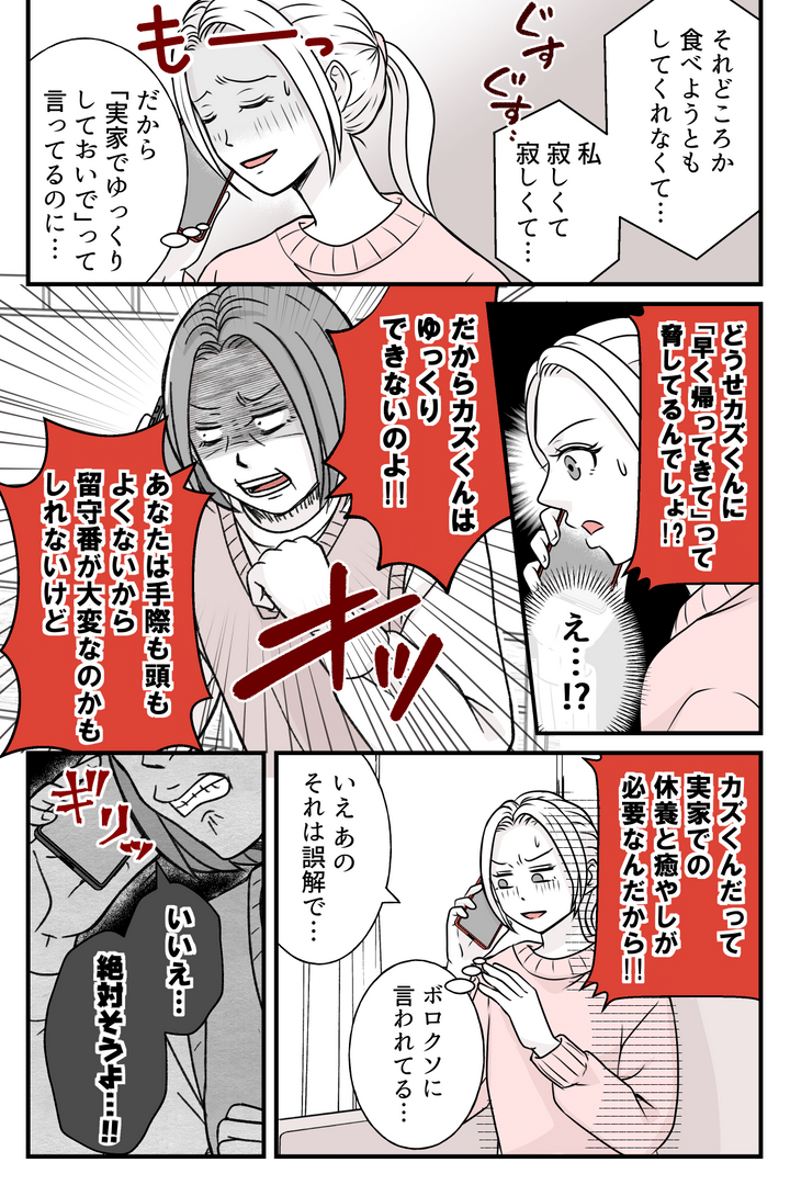 どうやら義母はカズキがすぐに帰ってしまうのが不満なようで、私が「早く帰ってきて」と頼んでいると決めつけていたようです。