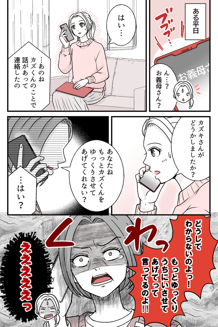 静かなひとり時間に鳴ったスマホの着信音は、義母からのものでした。恐る恐る電話に出ると「もっとカズくんをゆっくりさせてあげて!」と言われ、私は困惑してしまいました。